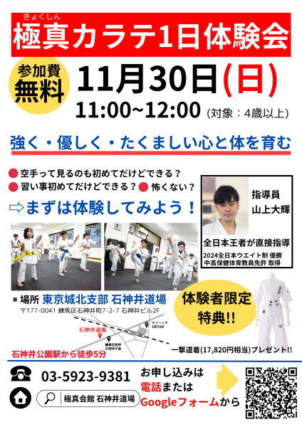石神井道場では11月30日(日)11:00-12:00に『極真カラテ1日体験会』を開催します。